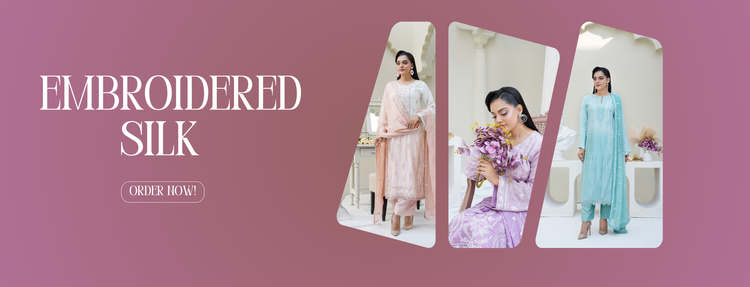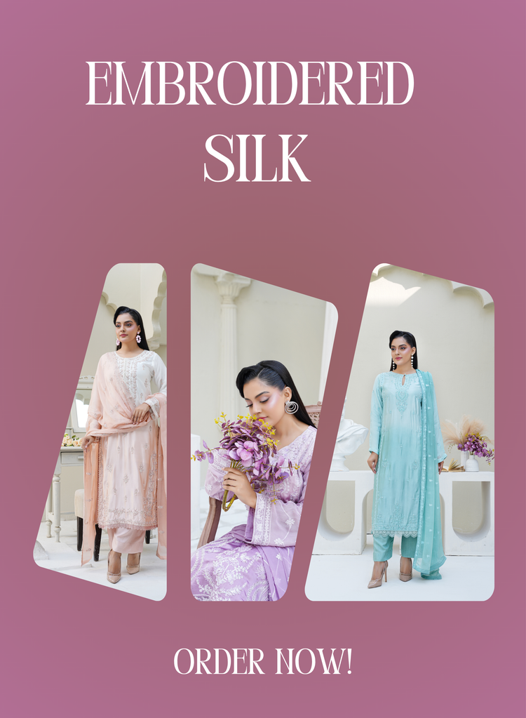 DESCRIPTION Elegantly made silk outfits with stunning needlework and hand embroidery paired with silk trousers and embroidered dupatta.