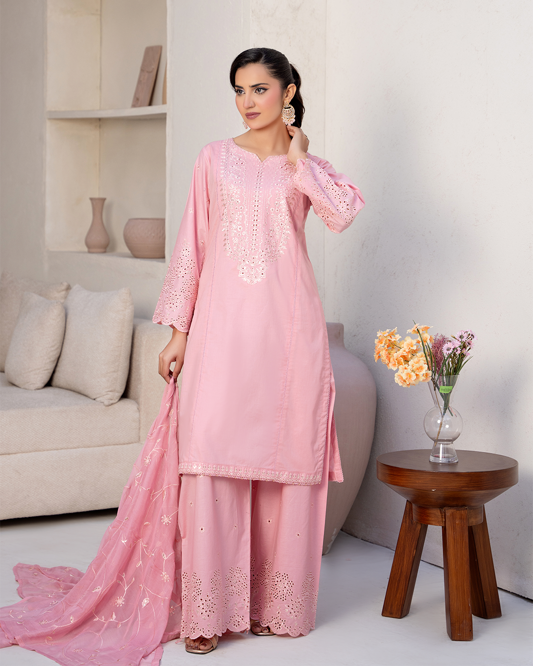 Exude timeless grace with this elegant chikankari embroidered suit. Crafted from soft summer cotton, the shirt features delicate embroidery along the neckline, sleeves, and hem for a refined, minimal look. Paired with matching trousers finished with subtle embroidered borders, the ensemble is completed with an embroidered chiffon dupatta adorned with soft floral detailing.