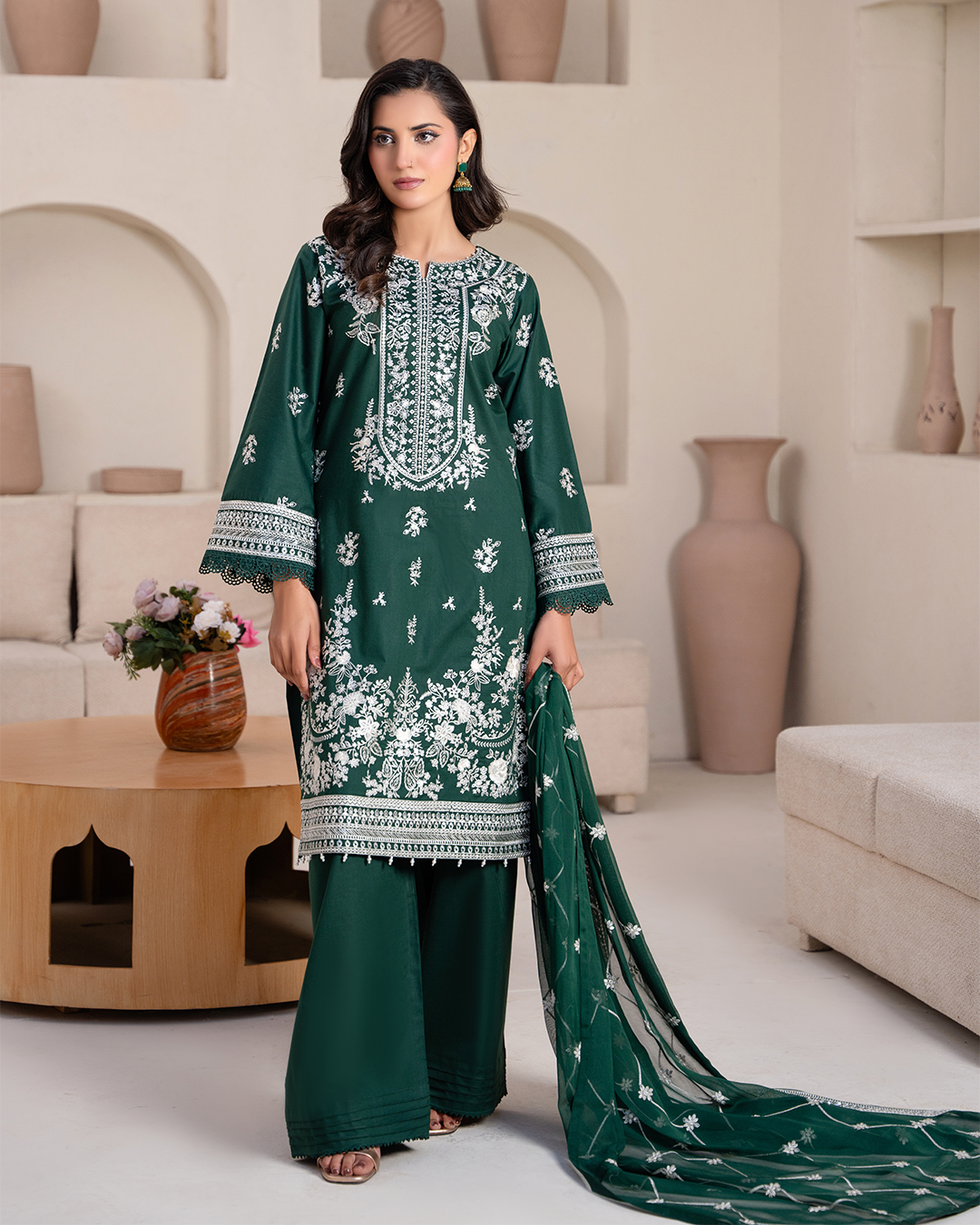 Exude timeless grace with this elegant embroidered suit. Crafted from soft summer cotton, the shirt features delicate embroidery along the neckline, sleeves, and hem for a refined, minimal look. Paired with matching trousers finished with subtle embroidered borders, the ensemble is completed with an embroidered chiffon dupatta adorned with soft floral detailing.