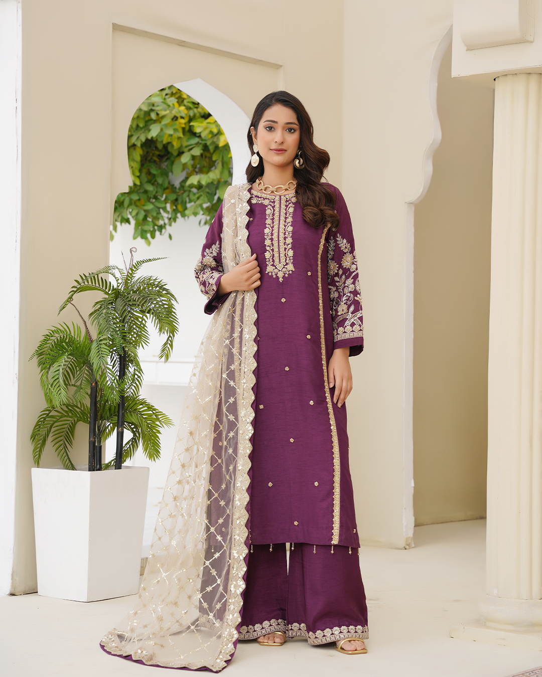 Make a statement with our exquisite outfit featuring a Raw Silk Shirt and Trouser adorned with intricate Ada Work Embroidery. Paired with a stunning Net Dupatta with delicate embroidery, this outfit is perfect for formal occasions.