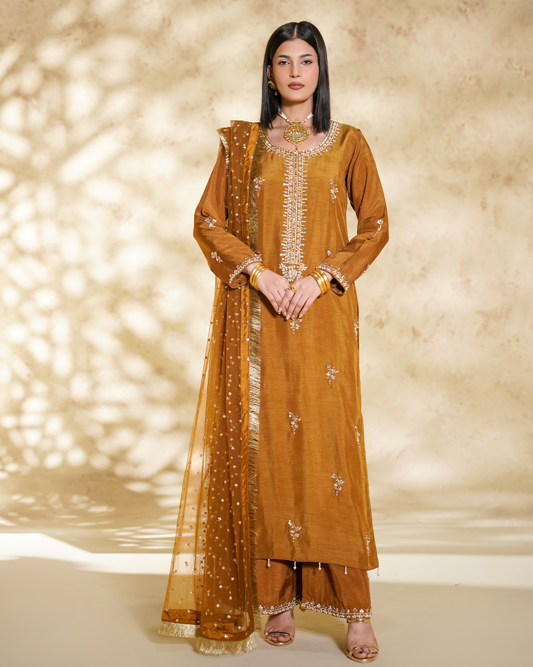 Excude luxury and sophistication with our stunning stitched 3-piece outfit featuring a Raw Silk Shirt and Trouser adorned with intricate Ada Work embroidery. Paired with a breathtaking embroidery Net fabric Dupatta with Sequence, Tilla and Thread Work. This outfit is perfect for making a statement at formal events.